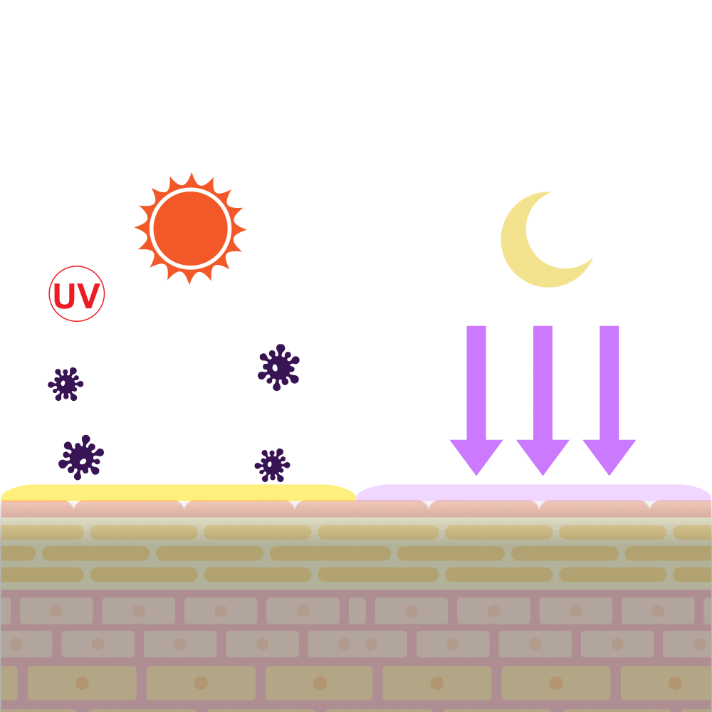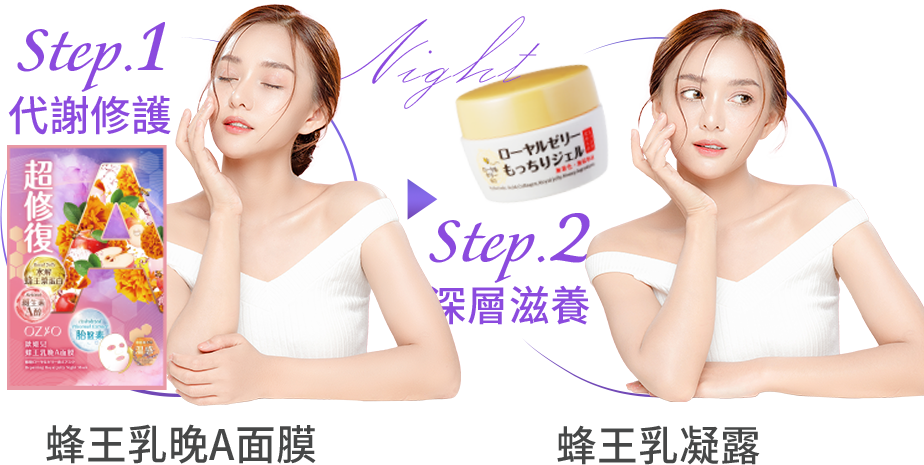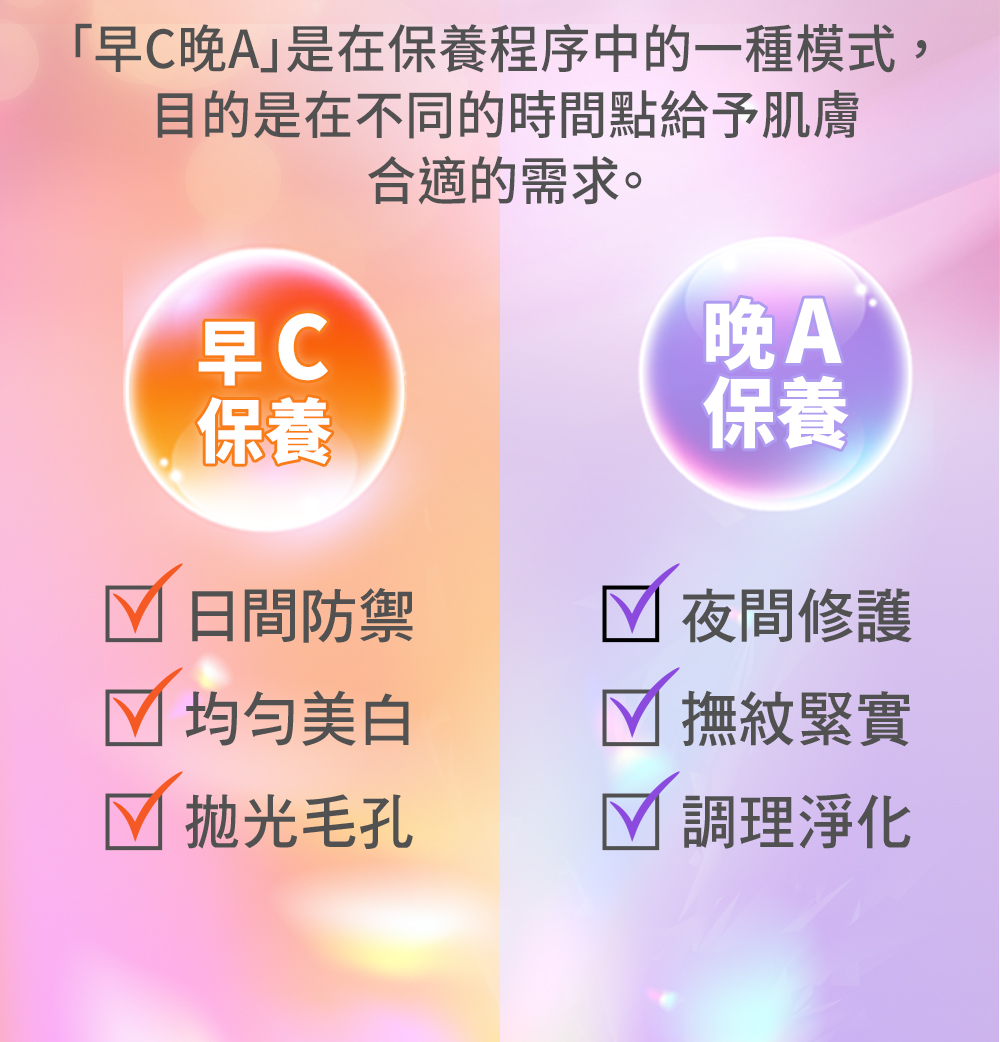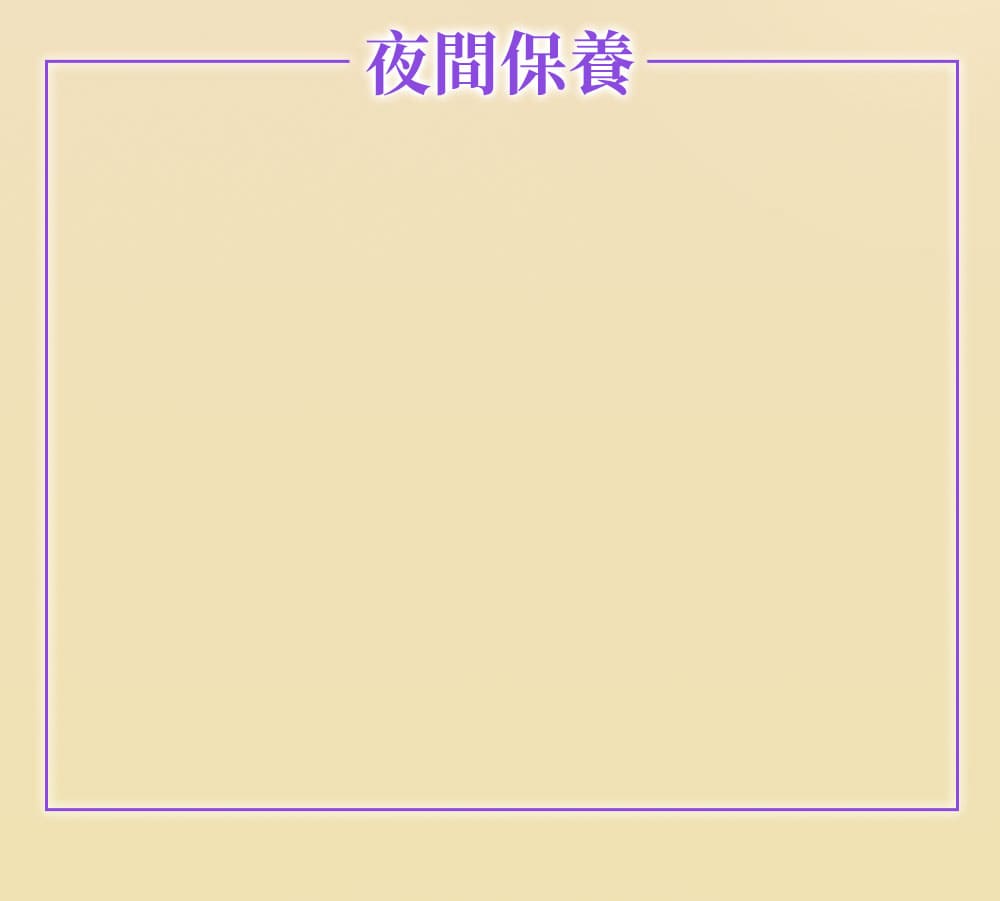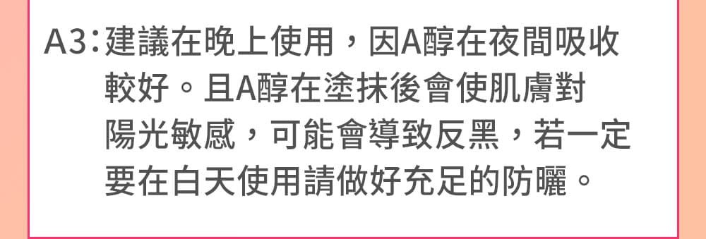 晚上使用含維生素 A(A醇、A醛、A酯)的產品,進行夜間修復,有助於促進細胞更新,加速肌膚的新陳代謝,淡化皺紋和細紋,同時也可以改善暗沉的問題,觸感更光滑。