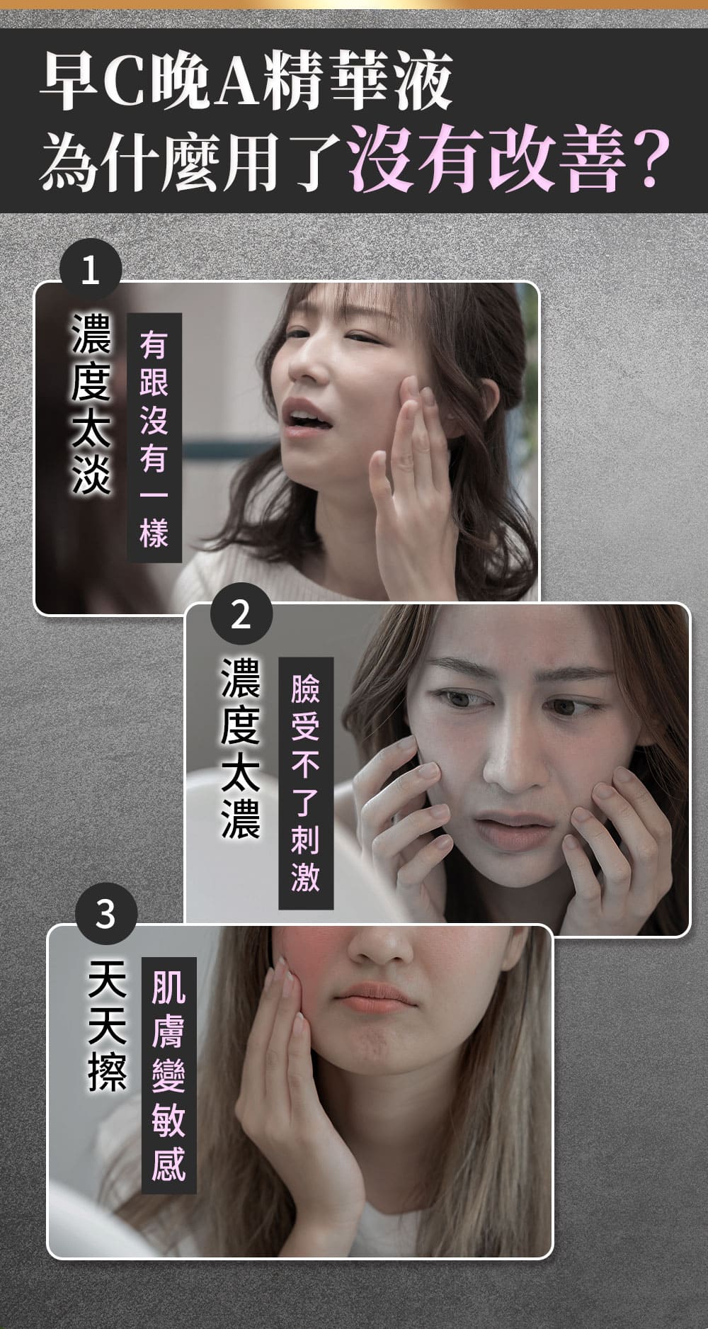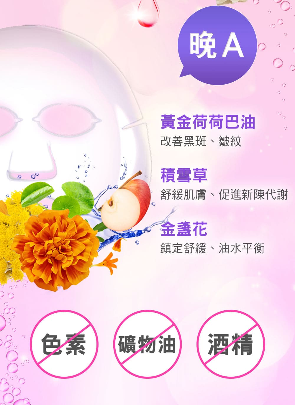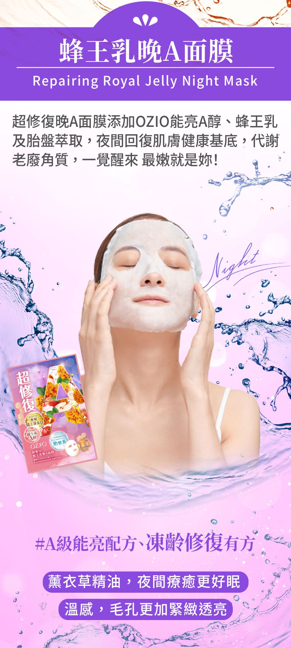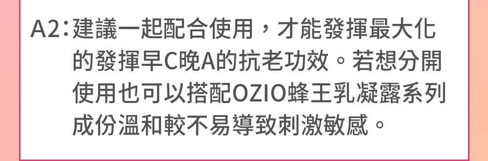 晚上使用含維生素 A(A醇、A醛、A酯)的產品,進行夜間修復,有助於促進細胞更新,加速肌膚的新陳代謝,淡化皺紋和細紋,同時也可以改善暗沉的問題,觸感更光滑。