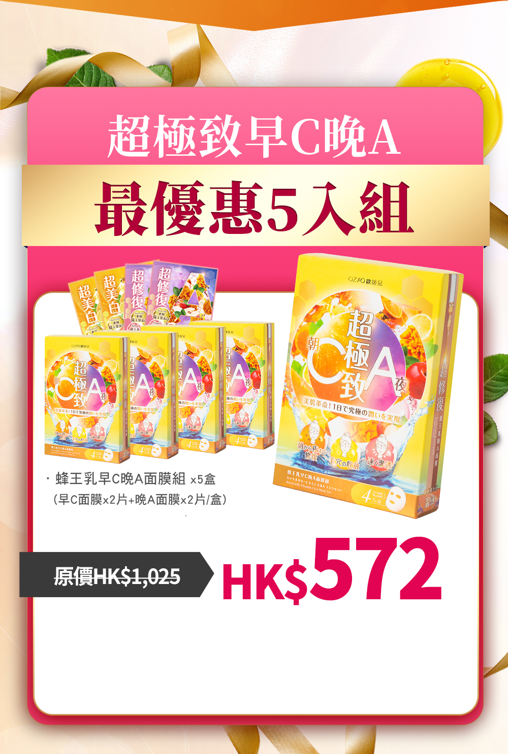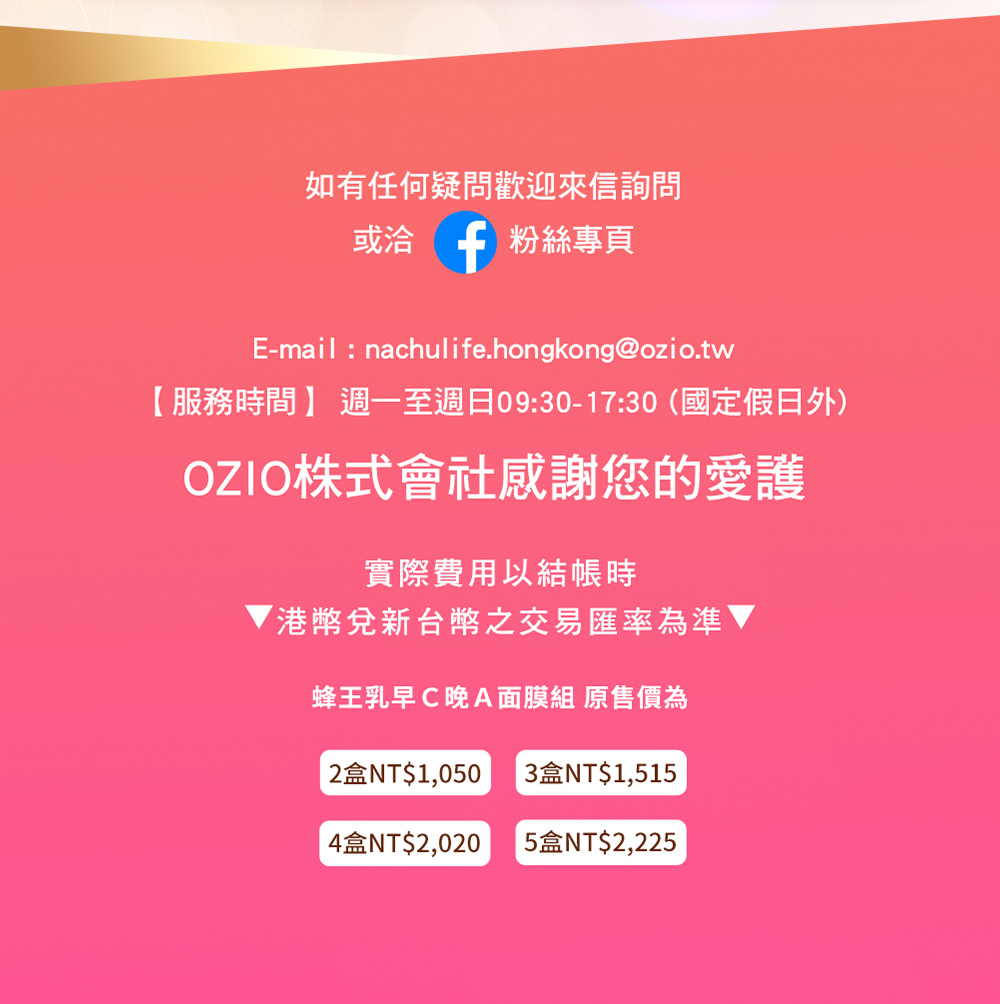 20、視黃醇、辛酸/癸酸三酸甘油酯、乳油木果脂、白藜蘆醇、高山火絨草花/葉萃取、辛乙二醇、德國洋甘菊花萃取、丁羥甲苯、金盞花花萃取、酵母萃取、法國臘菊萃取、氫化卵磷脂、苯甲酸鈉、山梨酸鉀、水楊酸、水解胎盤萃取、苯乙醇、檸檬酸、浮游生物萃取、1,2-己二醇、乙醯基六肽-1、乙基己基甘油、麥芽糖糊精、五肽-48
