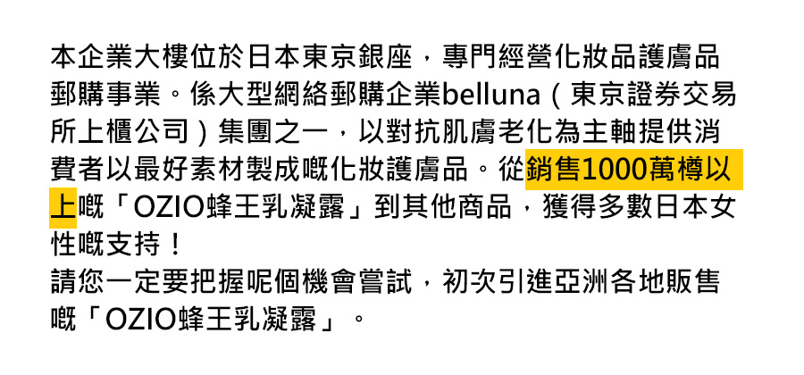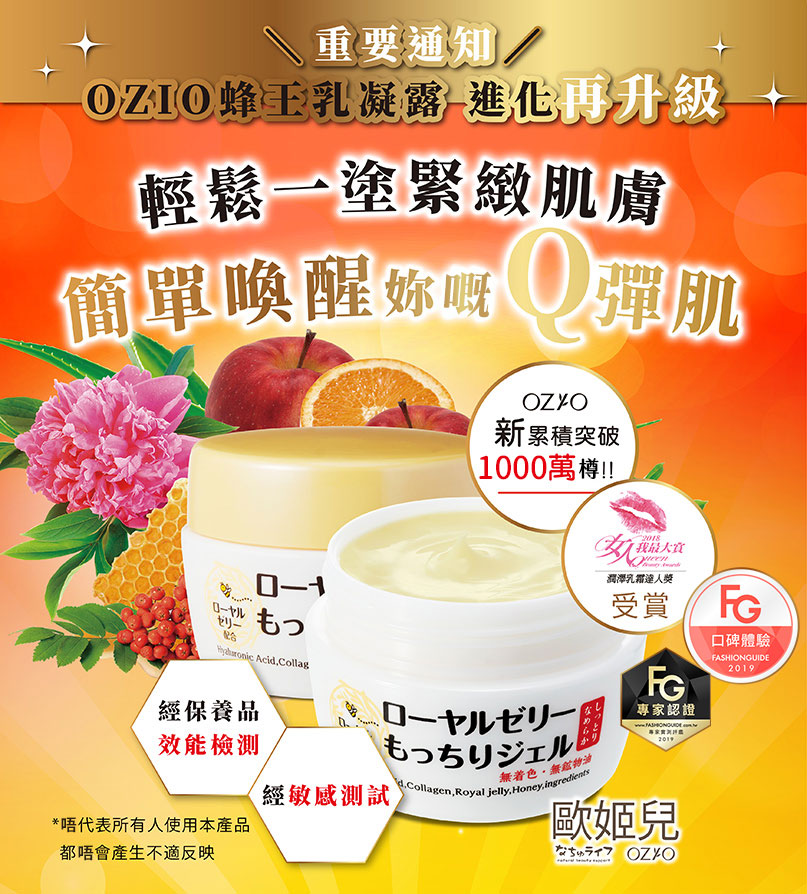 OZIO株式會社在推出OZIO蜂王乳凝露喺日本推出之後廣受消費者嘅鐘愛,銷售量突破10,000,000瓶!同時都一路不斷地收到來自各地使用者嘅感謝信函。優質商品嘅實力,大家有目共賭。